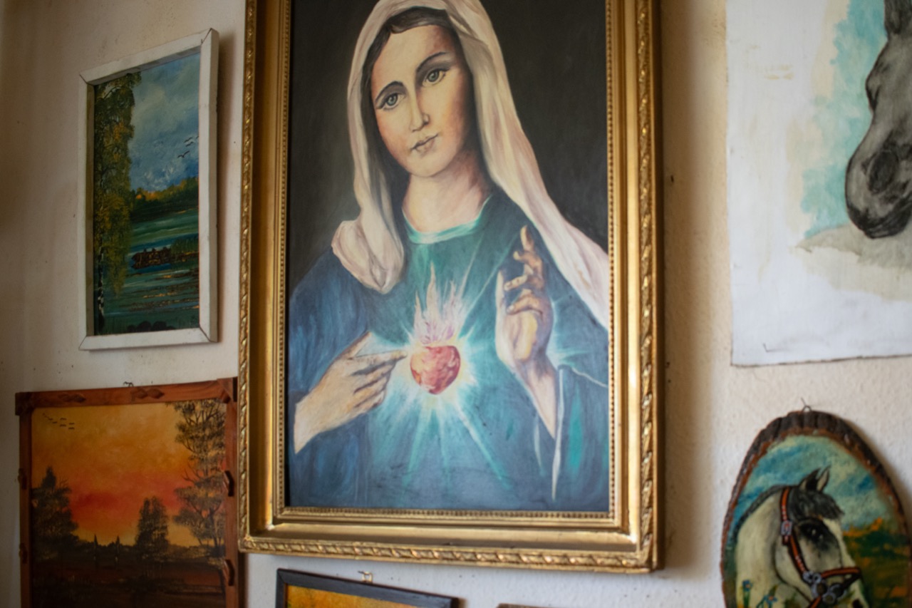 ZŚ: Miałem okazję też odnowić obraz Serce Pana Jezusa, który wisi w kościele. Obraz był 1,5 metra na 40 cm. Przedłużyliśmy z księdzem ramę, żeby był tak dużo jak wiszący obok obraz św. Brunona. Wtedy musiłam domalować ciąg dalszy obrazu. Po 4 godzinach zapytał „Artysta, jak Ty to zrobiłeś?” Odpowiedziałem – że to cud.